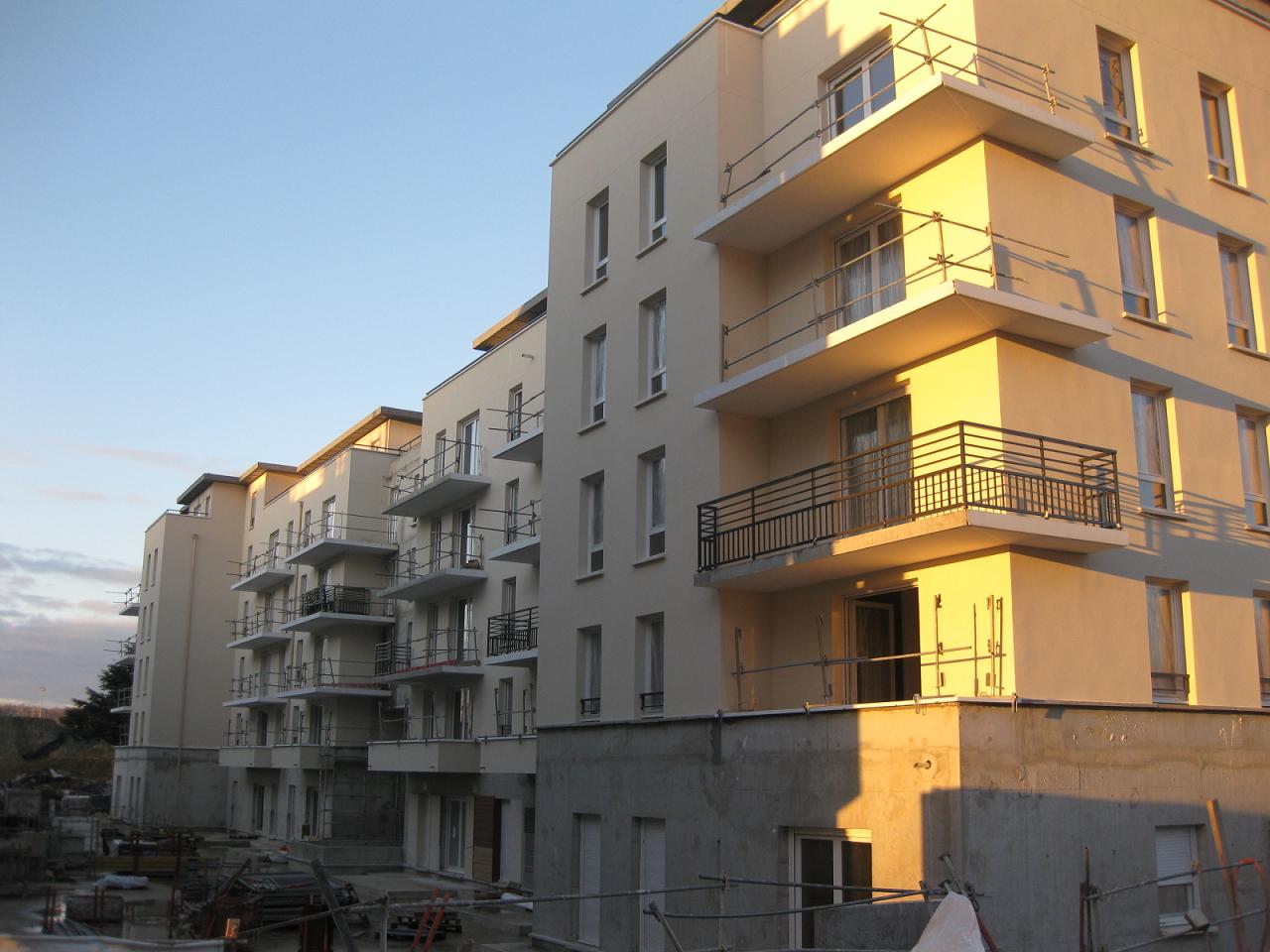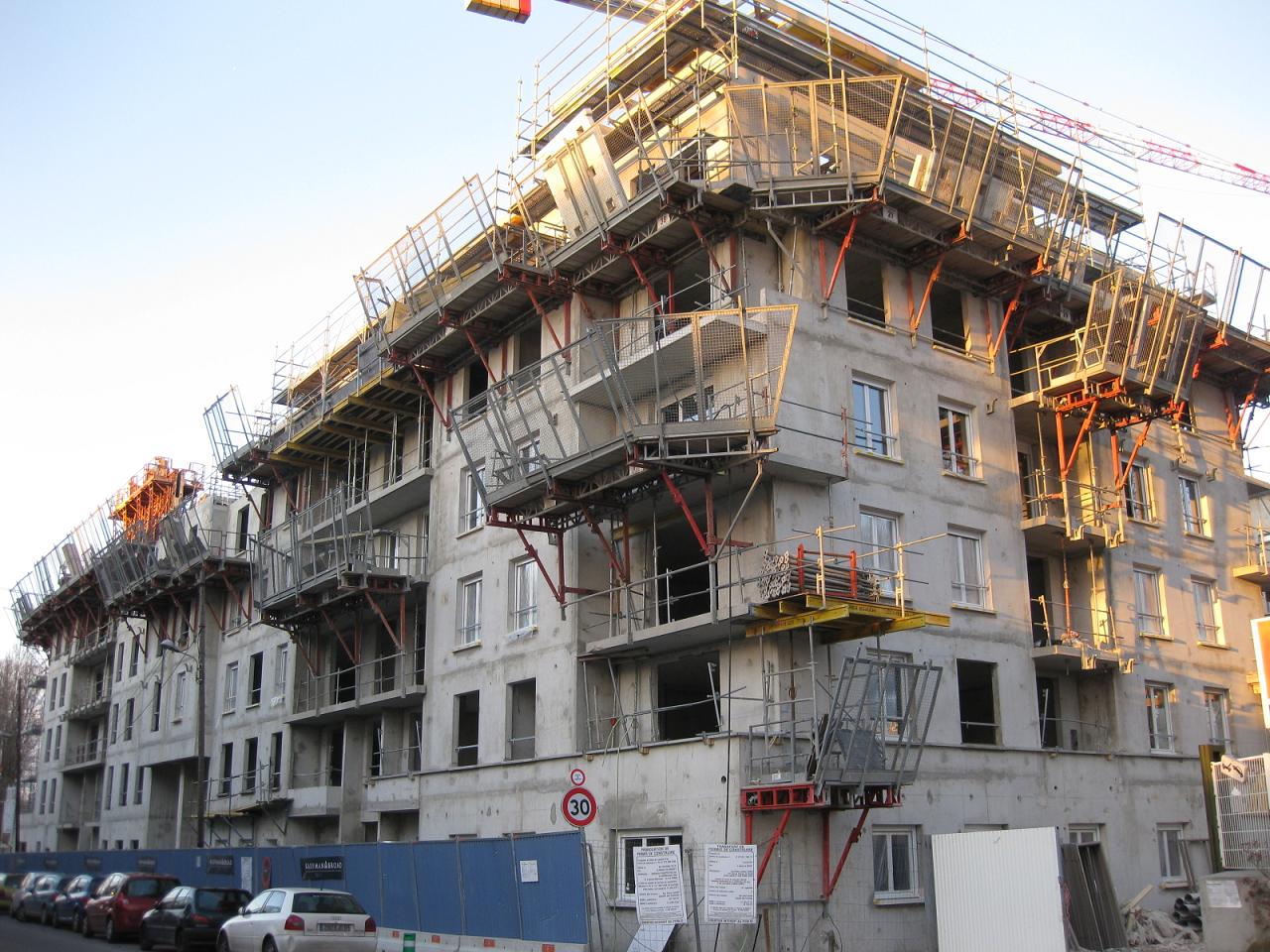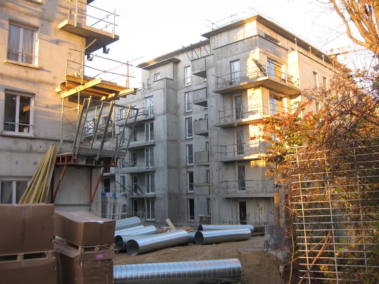 Voici des nouvelles photos de ce week-end. Bâtiment A : ils sont en train de poser le 5ème étage Bâtiment B : j'ai l'impression qu'ils sont en train de poser le toit (ce n'est pas très clair...). Les fenêtres sont posées et à des endroits même les volets. Bâtiment C : vous pouvez observer les balcons - plutôt classiques...