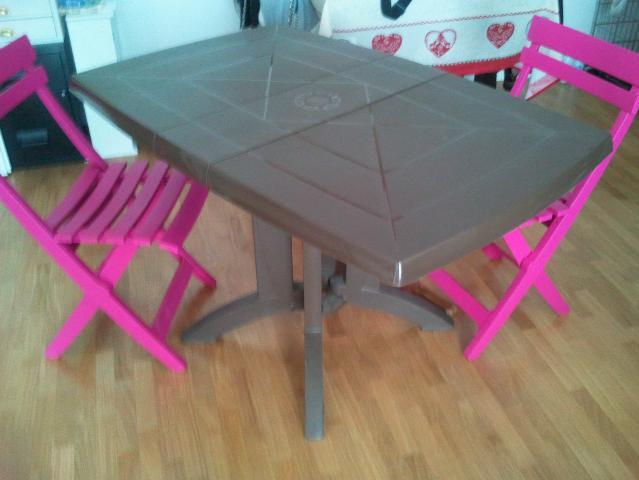 Si quelqu'un est intéressé par un petit salon de jardin composé de 3 pièces : une table rectangulaire pliable marron en résine (Long. 100 cm - Larg. 75 cm - Haut. 73 cm), 2 chaises fuchsias pliables (également en résine (cf. photo).