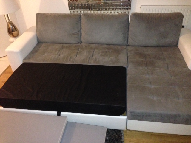 Suite à un démènagement je revends mon canapé neuf en tissu gris et blanc acheté à 700 euros en février 2013 chez But. Il comprend un tiroir de couchage ainsi qu'un coffre de rangement